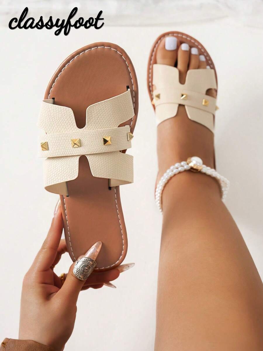 1 Pair Women's Fashion Rivets Snake Print Wide Fit Flat Sandals, Vacation Style, Summer Beige Slippers