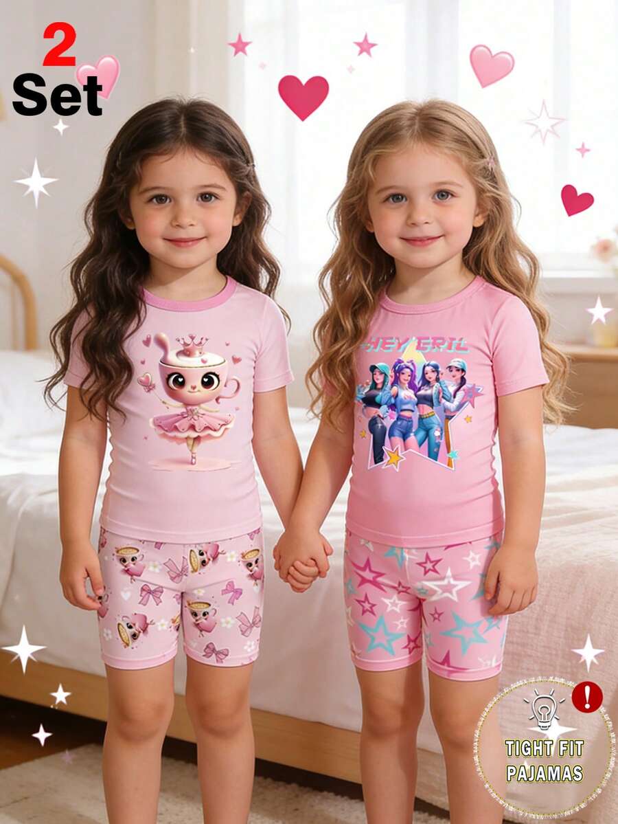 1 Set Baby Girls' Coffee Girl & Girl Group Print Contrast Collar & Cuff Design Knit Tight Fit Round Neck Short Sleeve Top And Allover Print Pants Pajama Set, Spring/Summer