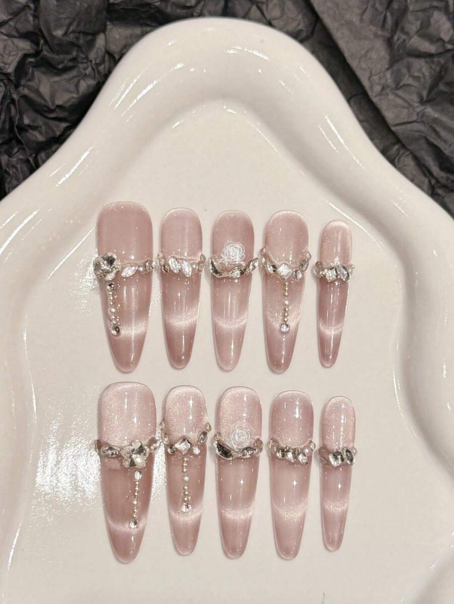 10 Pcs Luxury Handmade Press On Nails Super Long Stiletto False Nails Elegant Flash Drill Design False Nails With 3 Pieces Tool Adhesive Nail Glue Tabs Suitable For Ladies And Girls To Attend Holiday Parties. Nail Supplies Nails