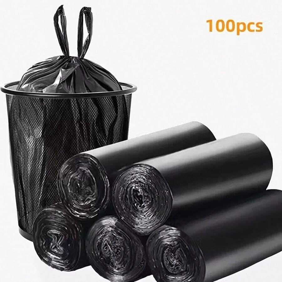 100pcs Black Garbage Bags, Made Of Durable PE Material, With Handles And Tear Lines.