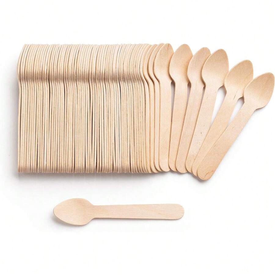 100pcs/Pack 100% Natural Birchwood Disposable Mini Dessert Spoons, 3.8 Inch/10cm, Suitable For Eating Desserts, Cakes, Ice Cream, Picnics, Camping, Parties, Summer Dinners, Portable