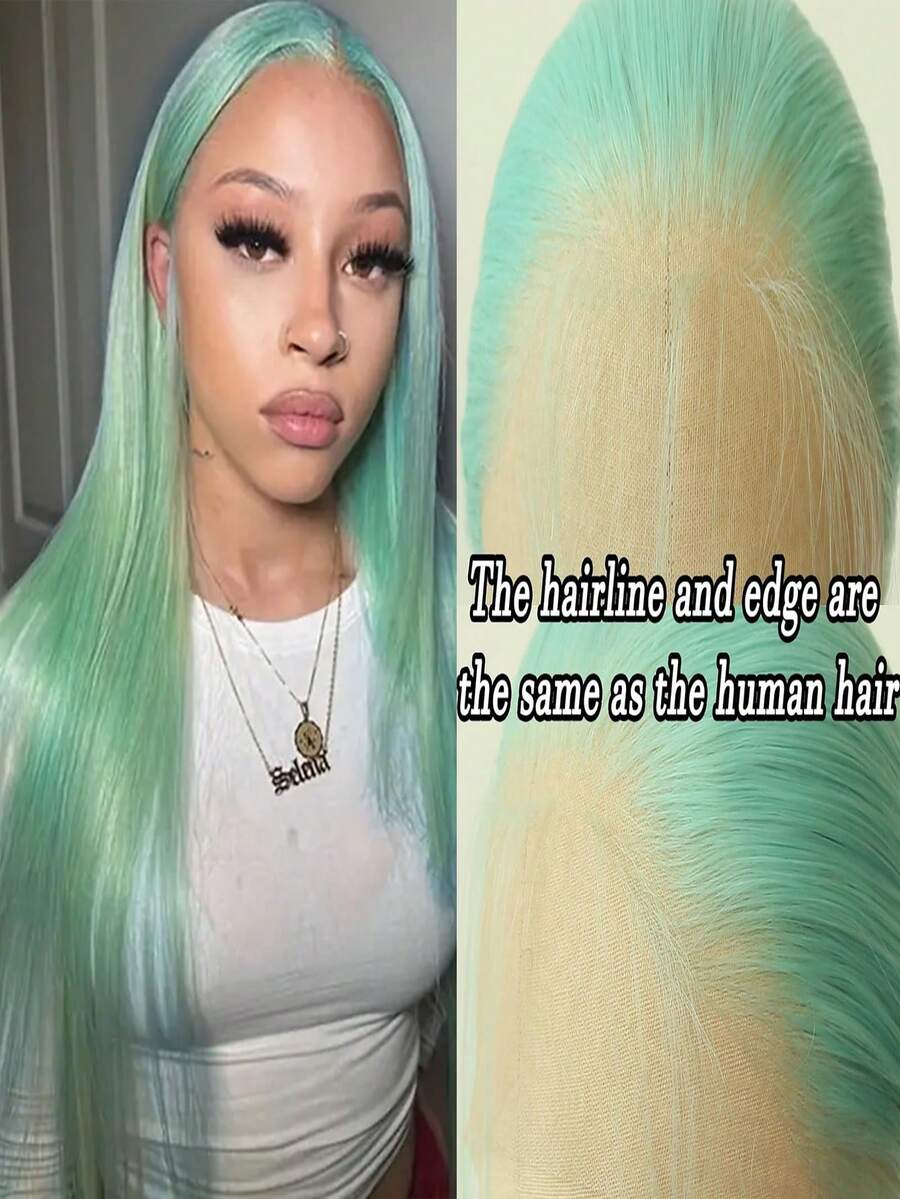 13x3.5 Inch Platinum Mint Green Synthetic Lace Front Wig, Straight Black Synthetic Lace Front Wig With Pre-Plucked Hairline, Heatproof Fiber Wig For Women