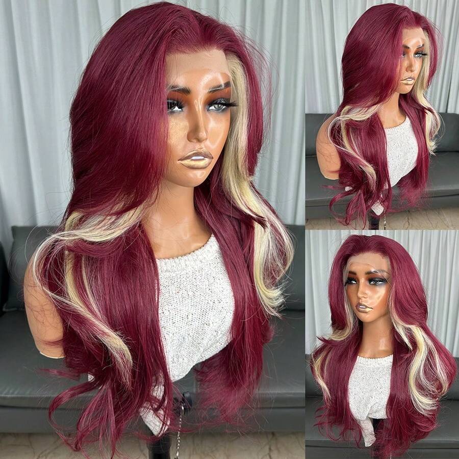 13x4 Burgundy Lace Front Wig Kanekalon Futura Hair 22 Inch Long Wave Highlight Wigs Curtain Bangs, Glueless Kanekalon Hair Resistant Synthetic Hair Wigs Free Part 150% Density Ready To Wear Synthetic Wigs For Daily Party Festival Holiday Use Beginner Friendly Wigs Transparent Lace Wigs