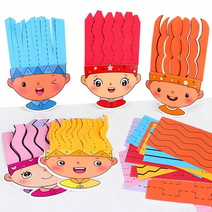 18pcs Kids Cartoon Character Hairstyle Paper Cutting Set, School DIY Barber Art Craft Activity Making Materials Scrapbooking