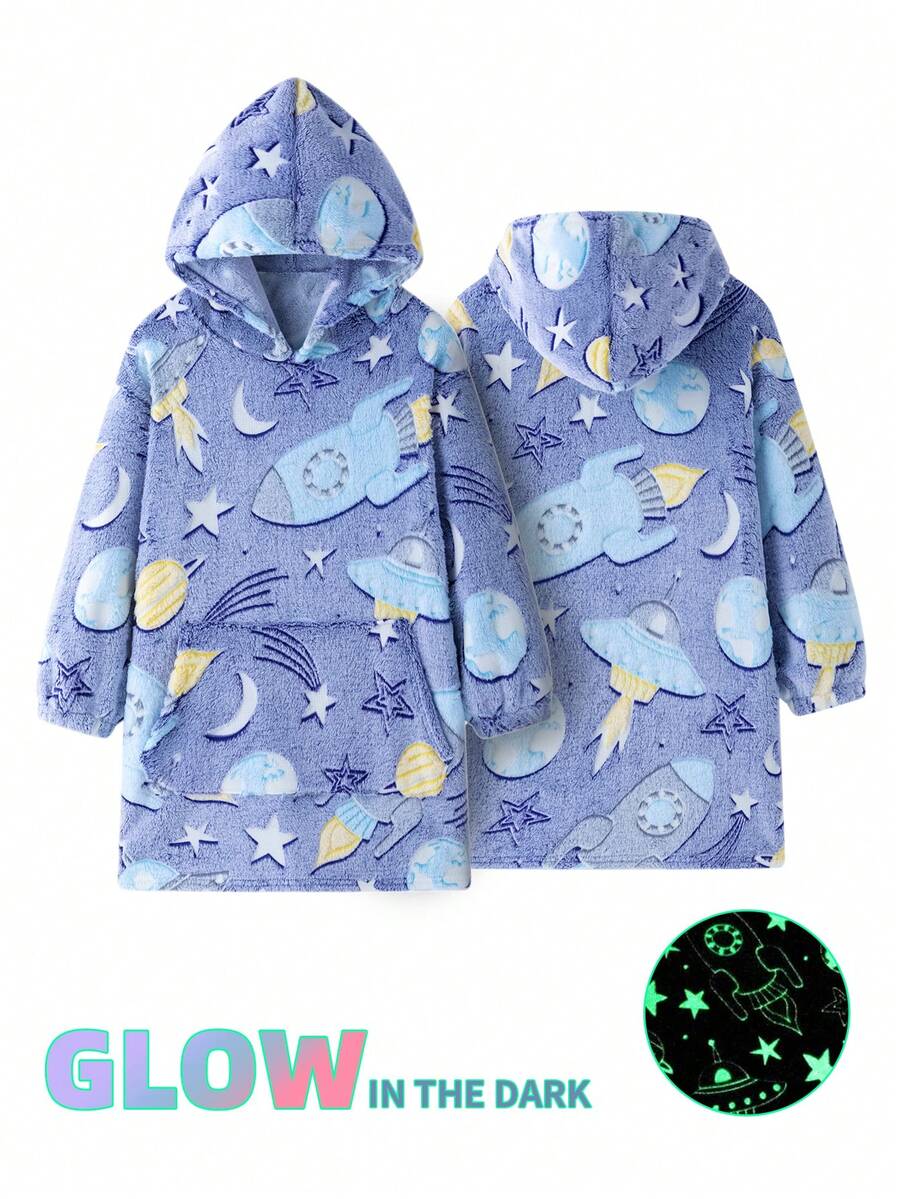 1pc Kids Glow In The Dark Hooded Blanket Sweatshirt With Pocket, Warm Flannel Unicorn Blanket Sweater