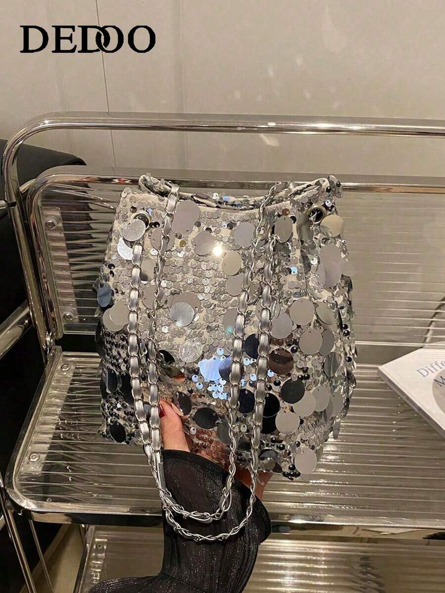 • 1pc Glitter Lightweight Large Capacity Women's Crossbody Bag, Fashionable Versatile Party Bucket Bag Suitable For Party, Travel, Evening Events - Silver - View 9