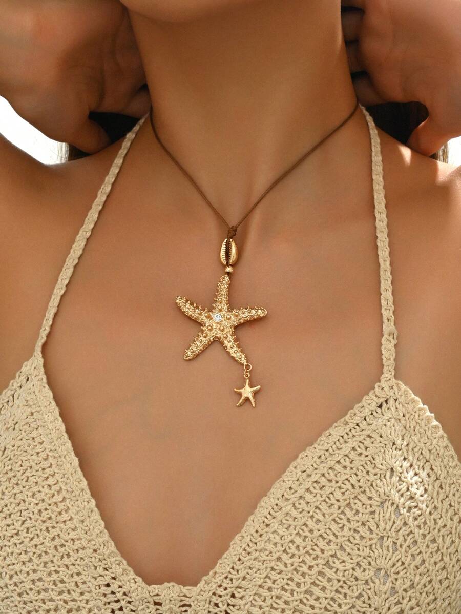 1pc Gold-Tone Fashionable Beachy Starfish Link Pendant Korean Wax String Necklace