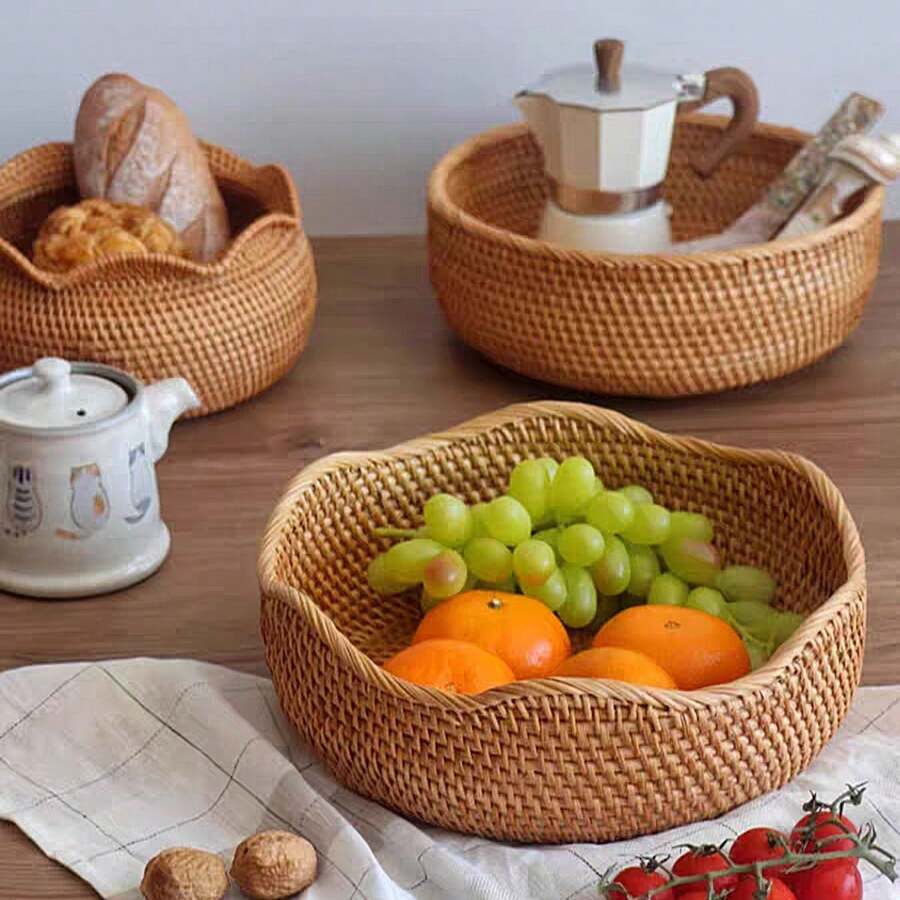 1pc Rattan Wave Rim Round Tray, Fruit Plate, Kitchen Storage Basket, Vegetable Basket, Handwoven Rattan Storage Bin