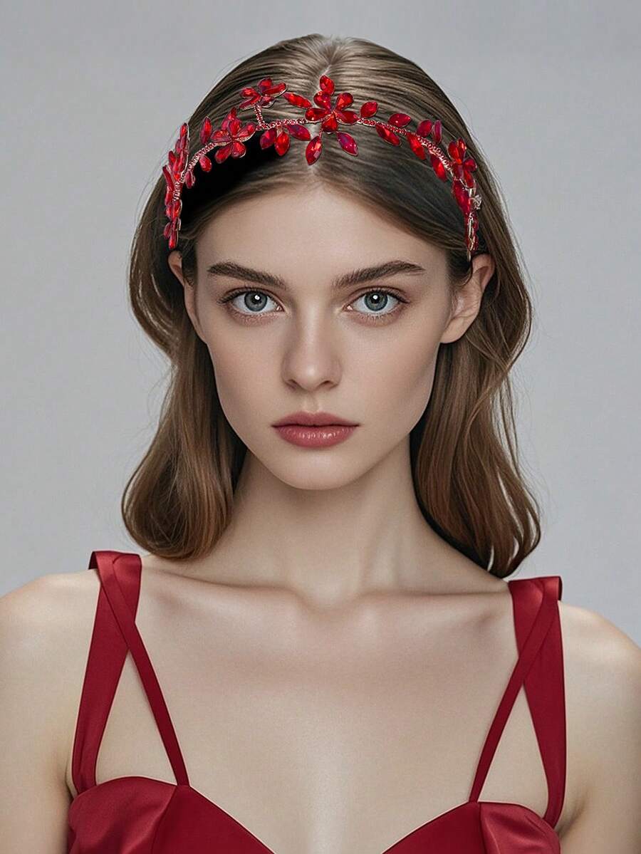 • 1pc Shiny Red Rhinestone Flower Headband, Elegant Bridal Flower Crown Headpiece Suitable For Wedding, Engagement, Party, Festival, Casual Wear - Red - View 11