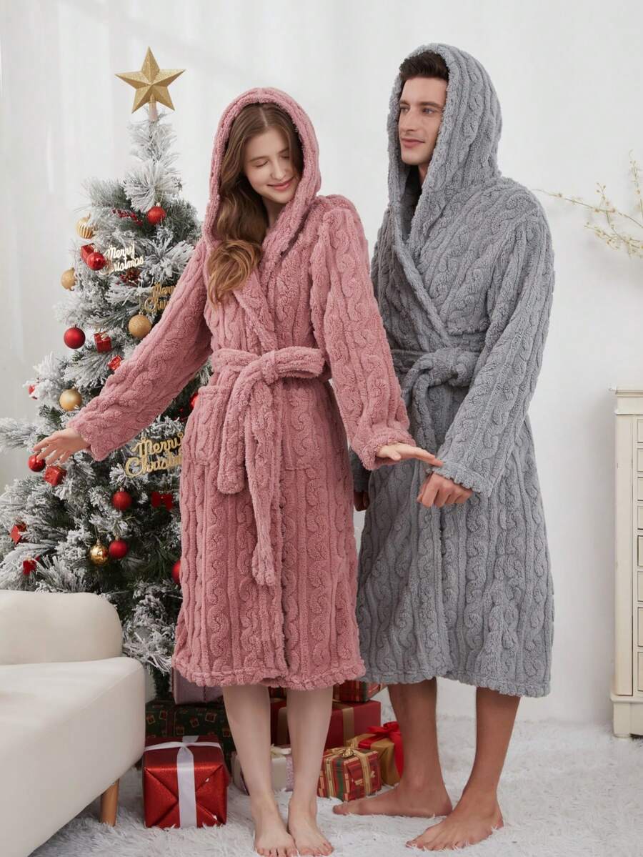 1pc Soft & Comfortable Jacquard Thermal Lined Long Fluffy Hooded Bathrobe With Pockets, Couple Style, Thick Double Layer, Suitable For Autumn/Winter