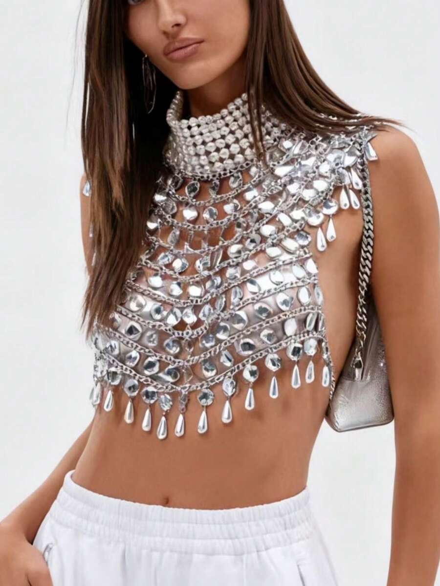 1pc Sparkling Full Crystal Rhinestone Silver-Plated Tassel Sexy Women's Body Chain Bra Top, Mesh Tassel Chest Chain Jewelry Necklace Lingerie, Luxury Crystal Body Jewelry Bikini Bra, Nightclub Shiny Mesh Tassel Rhinestone Bra Chain Pendant Body Chain Accessory, Sexy, Fashionable, High-End Crystal Embellished Chest Chain Top