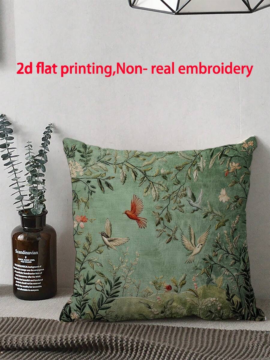 1pc Victoria Style Plush Green Plant & Bird Decorative Throw Pillow Cover, Machine Washable With Zipper, Woven Decor Cushion Case Suitable For All Rooms - Single-Sided Printed, No Embroidery