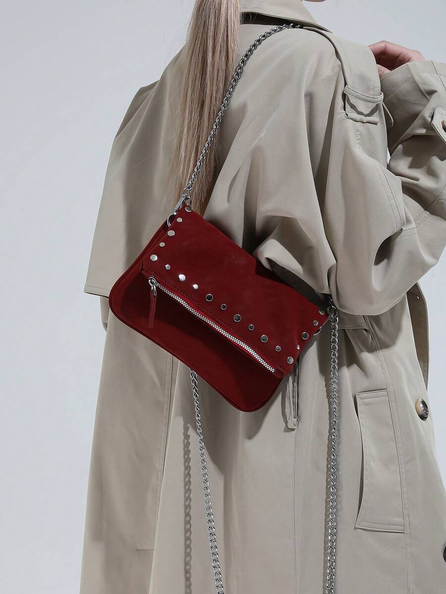 1pc Women's Burgundy Studded Chain Crossbody Bag | Waterproof Multi-Functional Mini Purse | Fashion Holiday Gift Bag For All Seasons