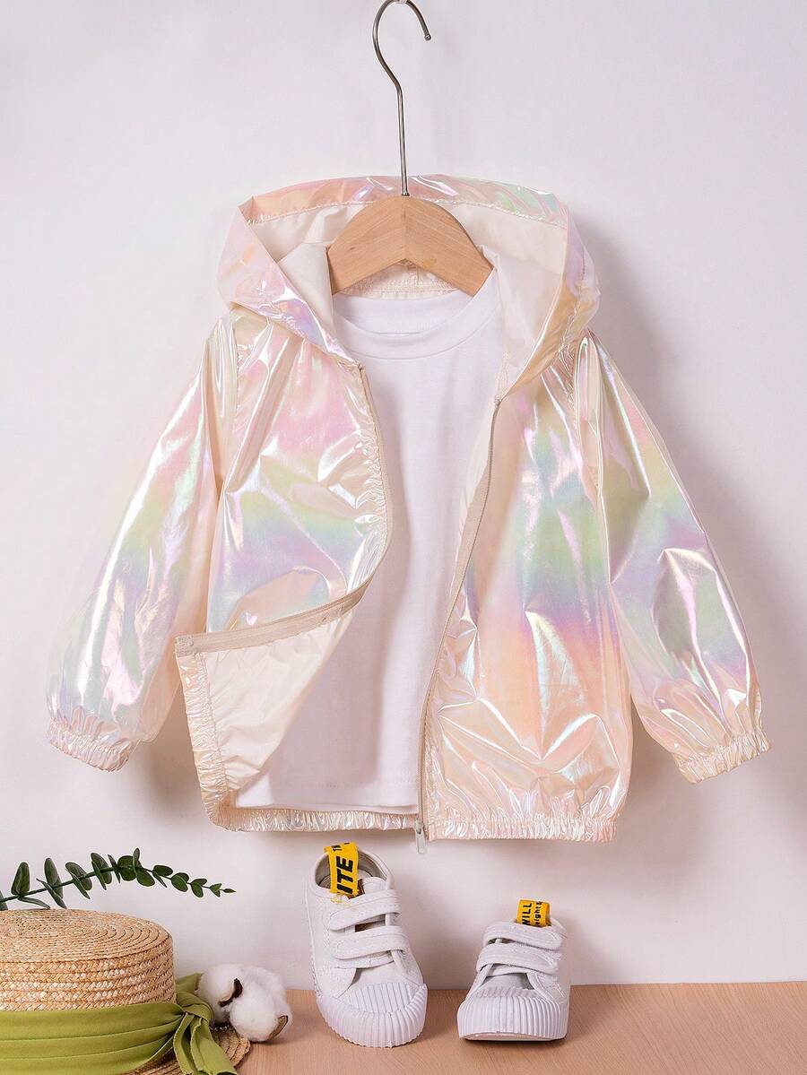 1pc Young Girl' Fashionable Short Jacket, Unisex Casual Iridescent Zipper Hooded Outerwear, Spring/Autumn