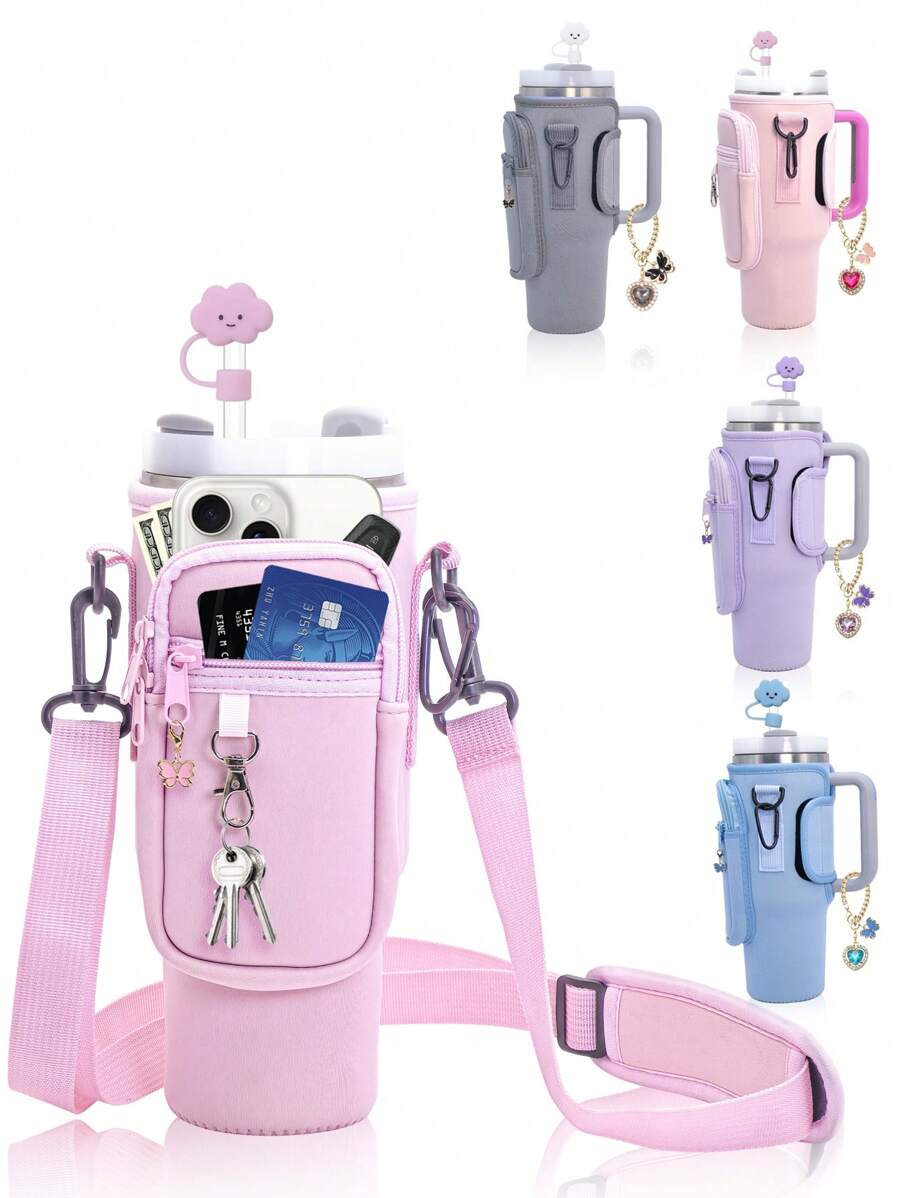 1set 40 Oz Case With Adjustable Shoulder Strap And Straw Hat Accessories,Double Storage Bag, Compatible With Stanley 40oz 30oz Tumbler,Neoprene Bottle Sleeve Pouch With Adjustable Shoulder Strap, Cup Accessory For Outdoor Activities, Office, Travel, Gifts, Sportss, Carry-On Bottle Accessory