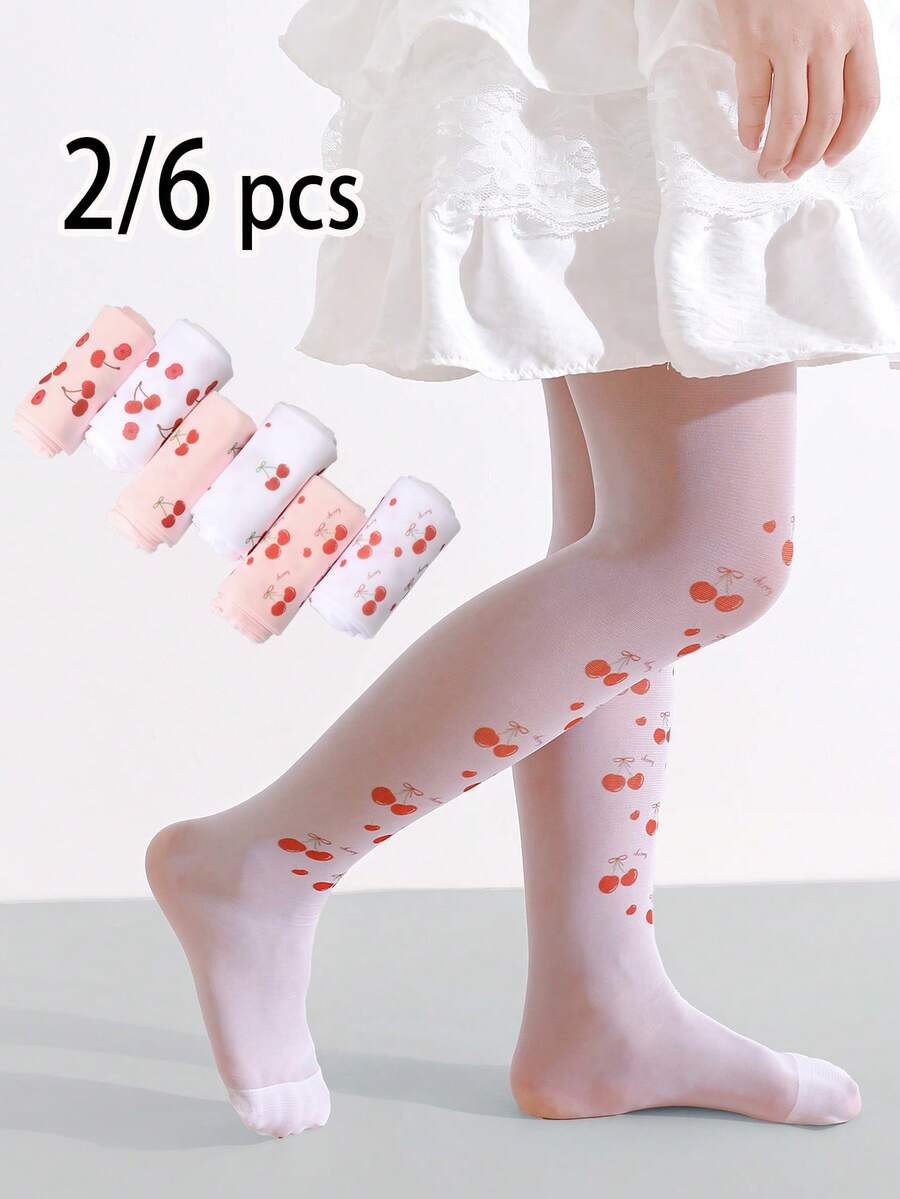 2/6-Pack Girls' Cherry Print Tights/Pantyhose, Ultra-Thin And Breathable Leggings For Spring And Summer.