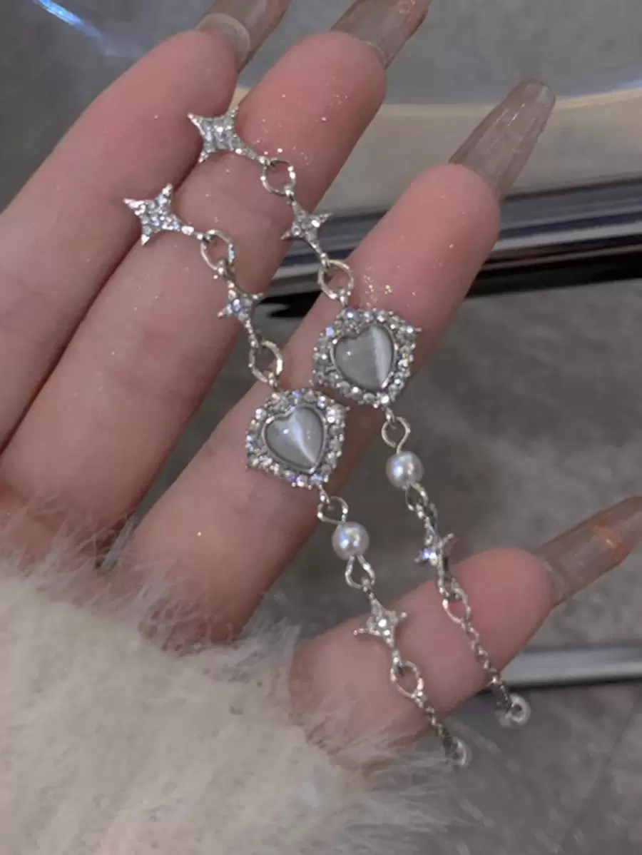 • 2 Pieces Of Fashionable Luxurious Faux Moonstone Heart Shaped Silver-Tone Tassel Earrings For Women Daily Wear Valentines,Mom,Mother,Mother's Day,Gift - Multicolor - View 5