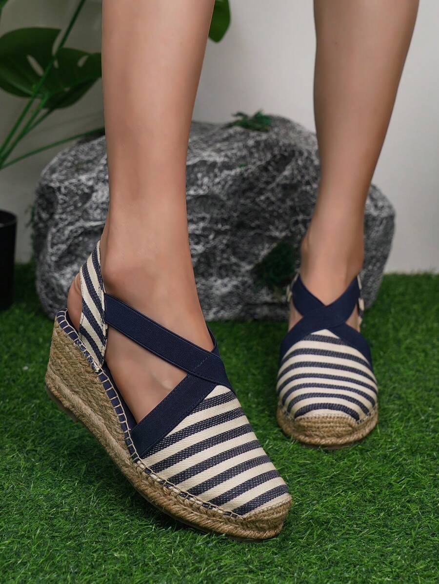 Suomihu 2024 New Arrival Women Espadrilles With Platform And Wedge Heel For Vacation, Solid Blue/Navy Blue Stripe & Woven Raffia Bottom Fisherman Sandals