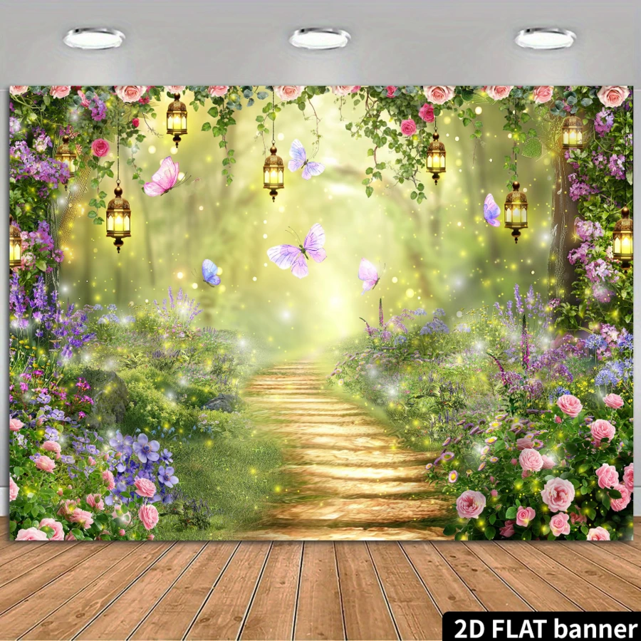 2D Flat Fantasy Jungle Backdrop Banner, Includes Green Jungle Foliage, Firefly Jars, Butterflies, Floral Path, No Power Needed, Suitable For Fairy Tale Parties, Indoor Bedroom, Outdoor Lawn, Can Be Used As Wall Decor Or Party Supplies, Fits Home