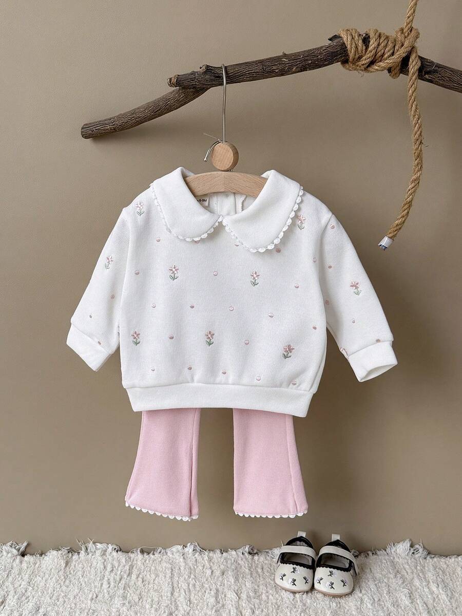 2pcs/Set Baby Girls Floral Embroidered Peter Pan Collar Long Sleeve Sweatshirt & Frilly Long Pants, Spring/Autumn