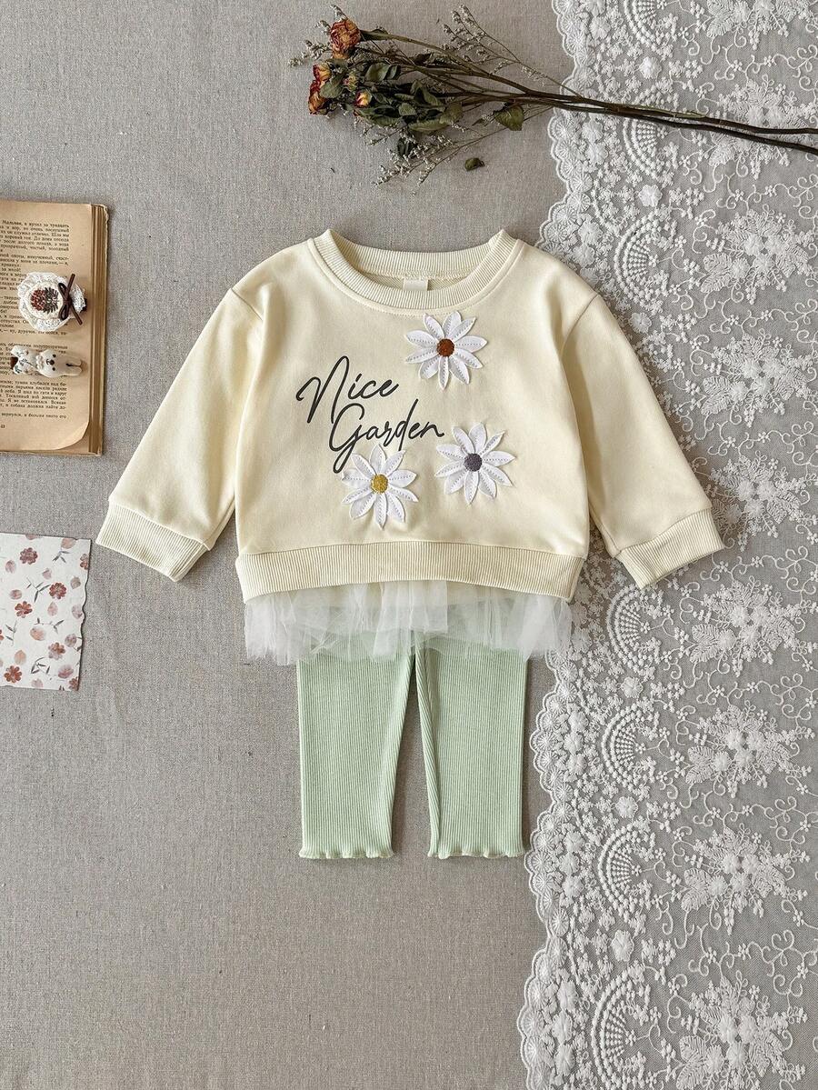 2pcs/Set Toddler Girls Flower Applique Mesh Hem Crew Neck Long Sleeve Sweatshirt + Green Pants, Spring/Autumn