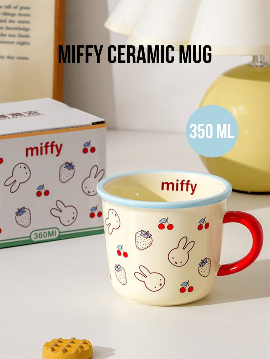 350ml Blue Strawberry & Cherry Pattern Ceramic Mug, White Body With Blue Rim And Handle, Adorable Cartoon Design, Minimalist Style, High-Temperature Decal Ceramic Material, Portable, Suitable For Daily Use, Office, Leisure, Breakfast, Intimate Moments, Especially Suitable For Cartoon Fans, Young Women, Students, Office Workers, Also A Thoughtful Gift For Loved Ones/Friends