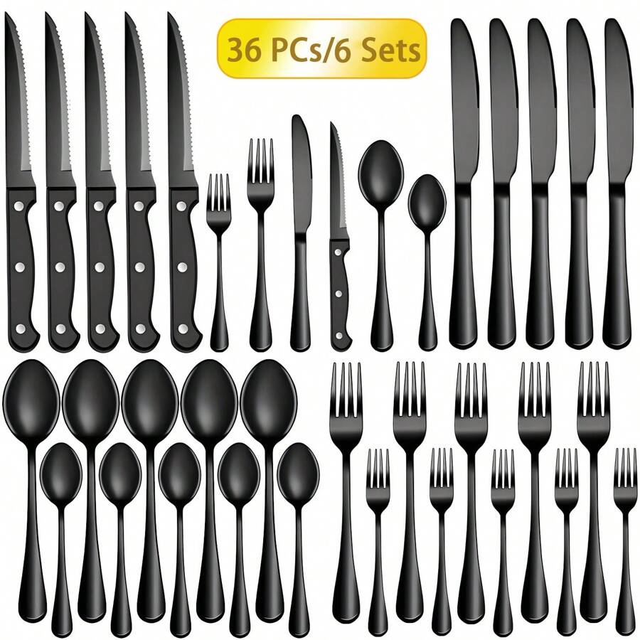 36-Piece Black Stainless Steel Cutlery Sets With Steak Knives Service For 6 Persons,Dishwasher Black Flatware Sets,Durable Silverware Sets Tableware Sets