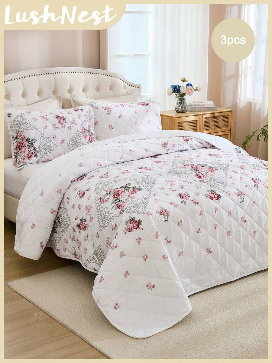 3pcs Floral Print Polyester Fiber Boho Chic Vintage Style Quilt Set, Includes 1 Quilt And 2 Pillow Shams, Suitable For Home Bedroom, All Season Decoration, Bedroom Setting