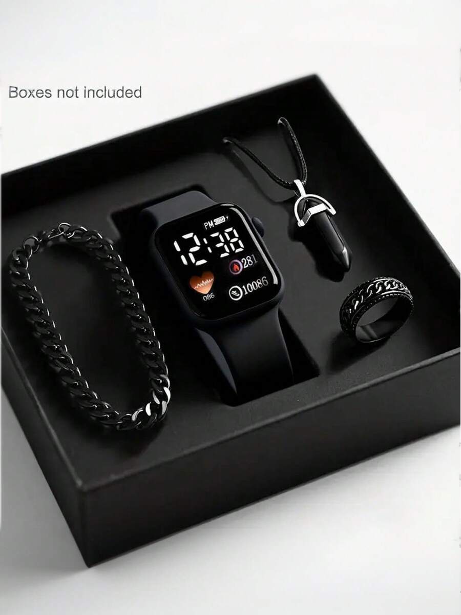 4/1pc Boys' Fashionable And Simple LED Heart-Shaped Digital Display Electronic Watch, Suitable For Boys To Wear, Equipped With Fashionable Bracelets, Necklaces, Rings And Sets, Suitable For Students, Very Suitable For Daily Life Such As School, Gatherings And Travel. Birthday Gift, Graduation Season, Christmas - The Perfect Gift For Boys(Box Not Included)