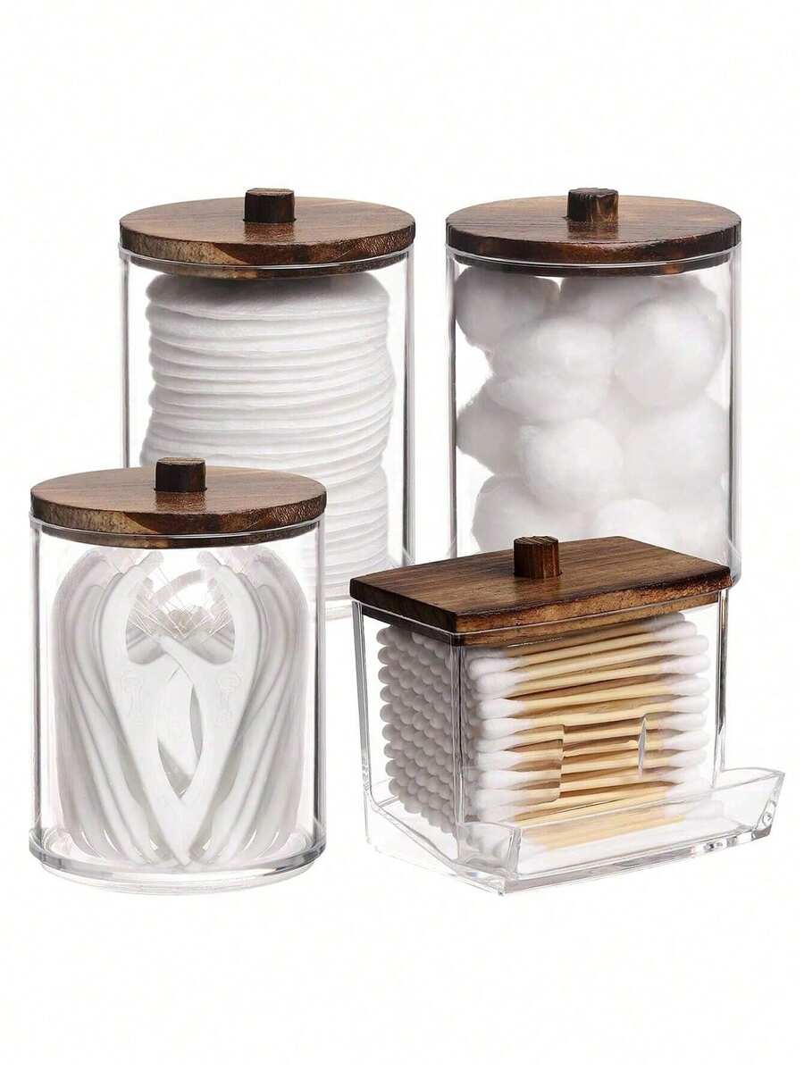 4 Packs Qtip Cosmetic Containers, 10/7 Ounce Round Cosmetic Cleaning Swab Dispenser, Medicine Bottle With Bamboo Lid For Organization And Storage,For Holiday Beach, Bathroom Collection, Bedroom Collection, Large Capacity
