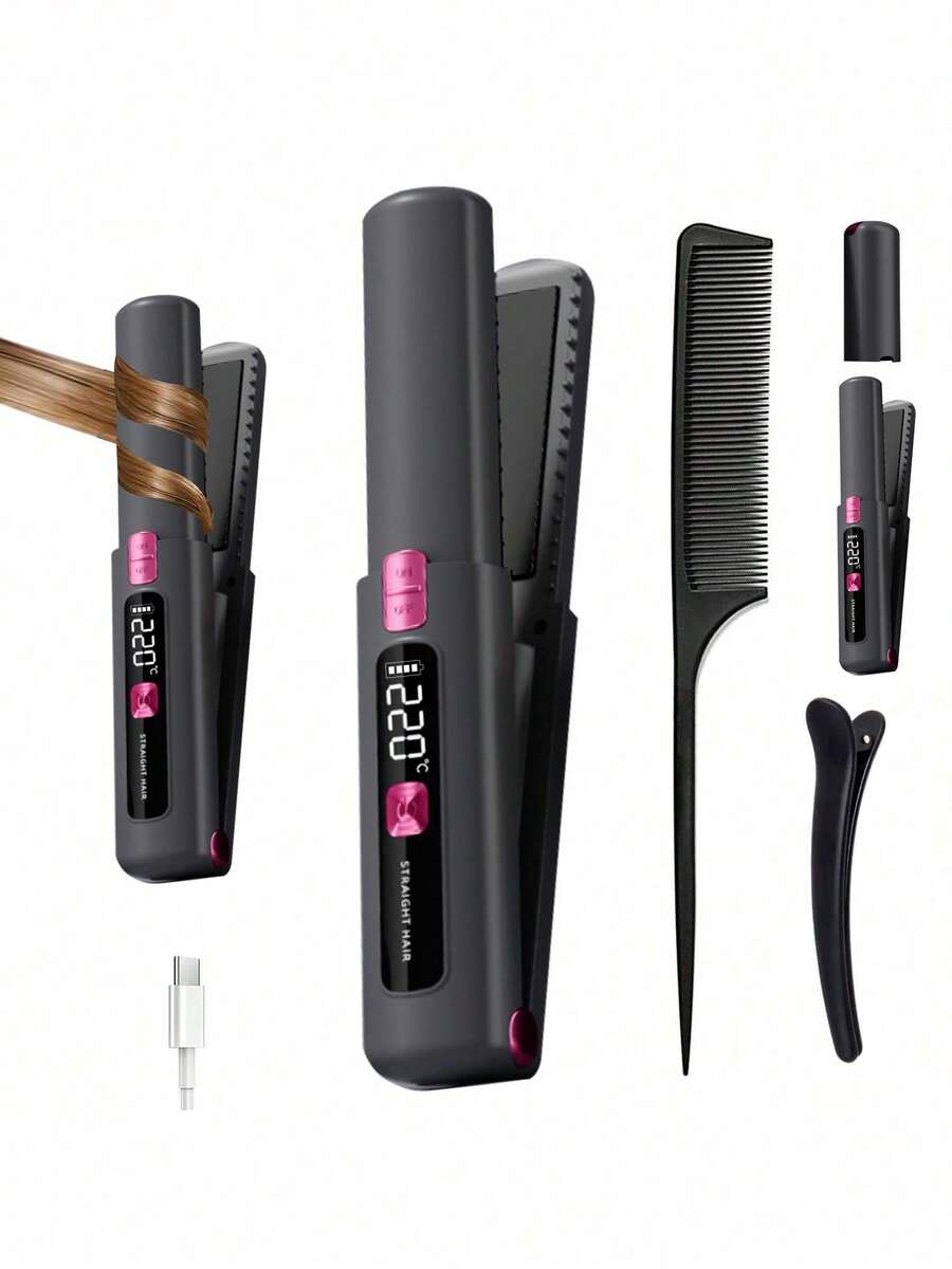 4500mAh Wireless Rechargeable Hair Straightener With LCD Display, 2-In-1 Portable Travel Hair Straightener & Curler, Mini Ceramic Hair Curling Iron, USB Rechargeable Hair Styling Tool, 4500mAh Battery Capacity