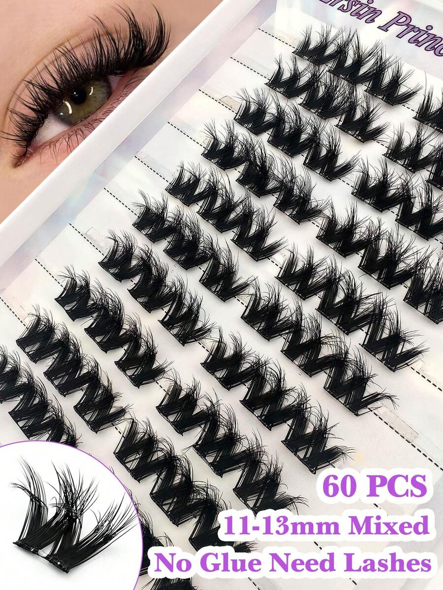 60 Pcs D-Curl No Glue And No Remover Need Self Adhesive Lashes Cluster Fluffy 11-13mm Mixed Lengthes Kit, No Glue Needed Fluffy Individual Lashes Self Adhesive DIY Eyelashes Extension Pre-Glued Cluster Lashes Natural Wispy Lashes Extension C Curl Lash Clusters No Glue Need No Remover False Eyelashes