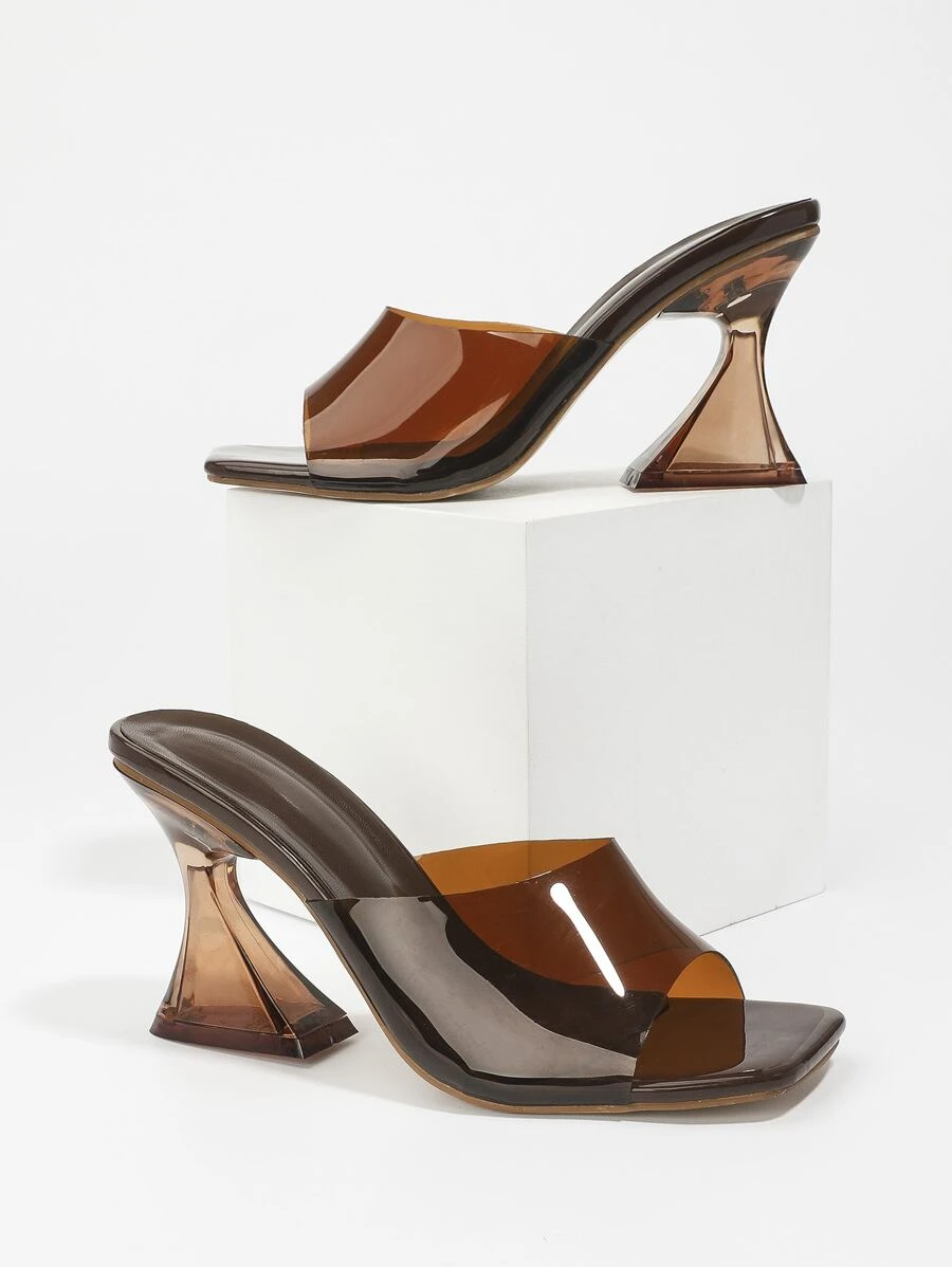 8.5cm Square Toe Brown High Heel Transparent Mule Sandals, Asymmetric Heel Acrylic Open Toe Slides, Summer New Styles For Daily Wear/Beach Party Women Shoes