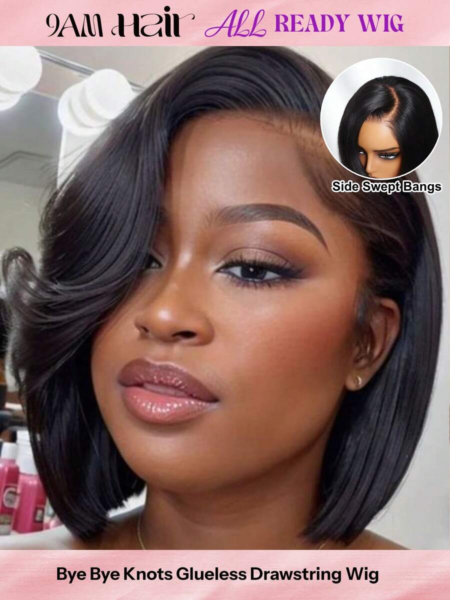 ALL READY WIG Bye Bye Knots 7x5 Lace Closure Side Part Layered Bob Glueless Wig With Side Swept Bangs With Invisible Drawstring Natural Hairline Pre Cut Pre Pluck Pre Bleached Tangle-Free Transparent Lace 100% Human Hair Beginner Friendly
