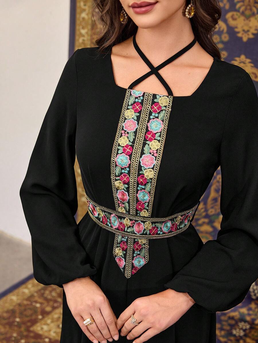 Al Najma Black Arabic Style Dress With Embroidered Floral Trim, Cross-Tie Neckline And Belt