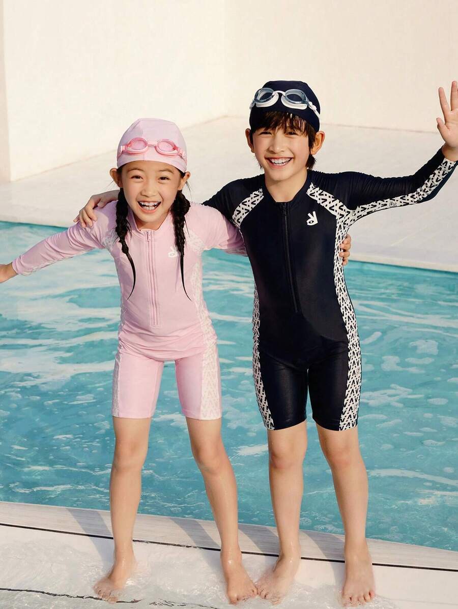 Annil Boys And Girls Summer Long Sleeve Sun Protection Kids One Piece Swimsuit With Swim Cap 2-Piece Set Pink