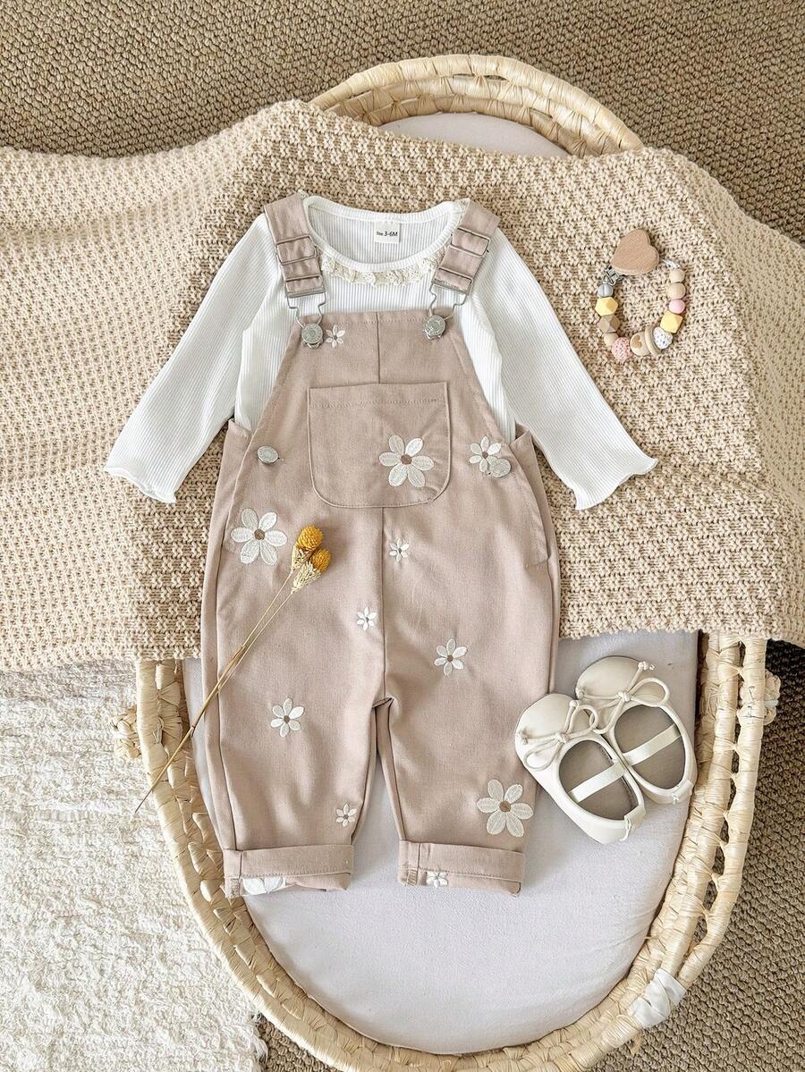 Baby Girls' Casual All-Over Embroidered Floral Light Blue Suspender Pants, Summer