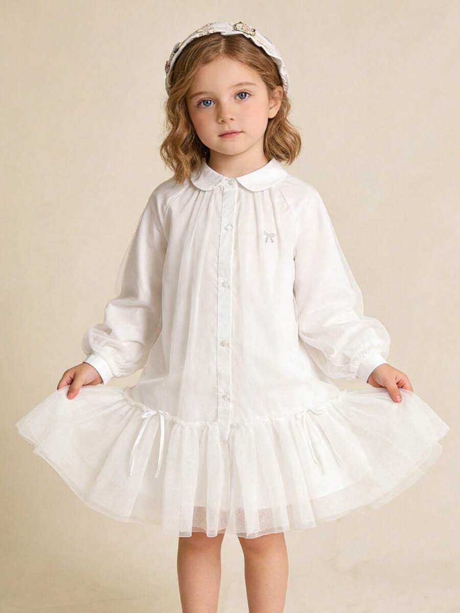 Balabala Girls' Mesh Patchwork Ruffle Hem Bow Print Long Sleeve Shirt Dress, Spring 2026 Collection