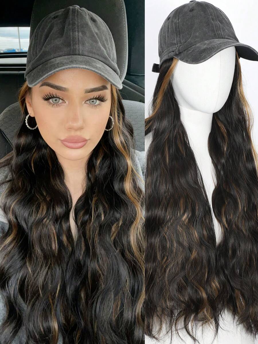 Black Knitted Hat/Baseball Cap With Water Ripple Curly Hair Women's Synthetic Wig Fashionable And Warm Suitable For Christmas Outings