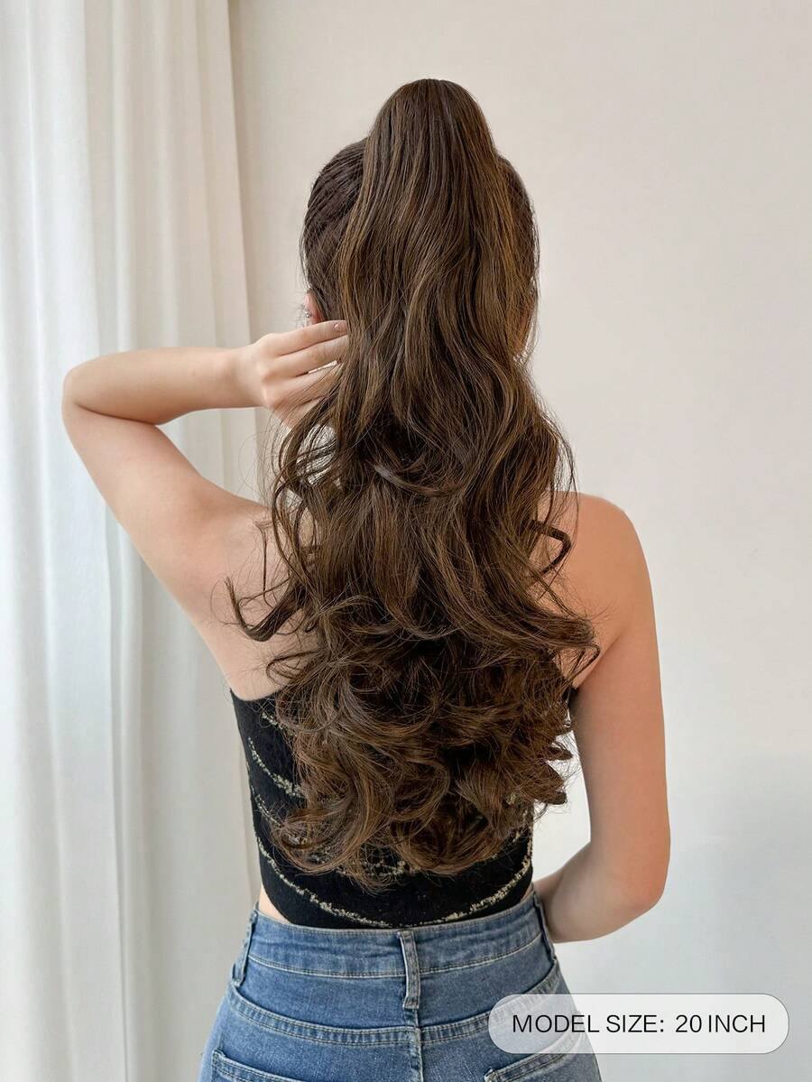 22-24 Inch Natural Wave Heat Resistant Synthetic Ponytail Hair Extensions, Claw Clip On, Suitable For Daily Wear, Black Brown