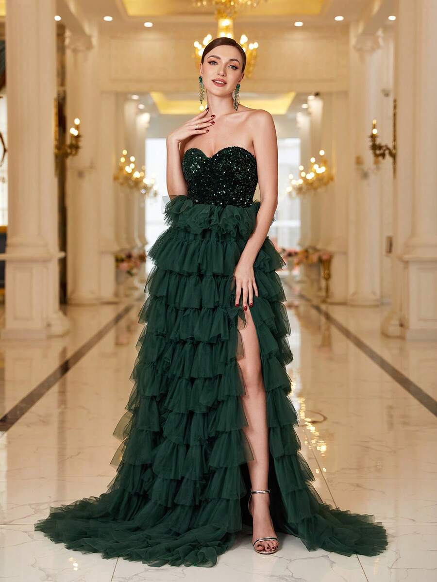 Faeriesty Gorgeous Sequin-Covered Gown With Layered Tulle Skirt & High-Slit Hem | Luxury Evening Dress For Black Tie Galas, Weddings, And Cannes Parties