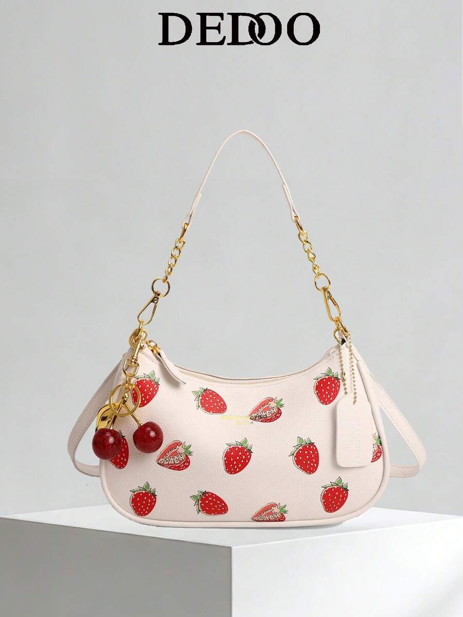 Dedoo 2026 New European And American Style Underarm Handbag/Crossbody Bag With Cherry/Strawberry Print, Crescent Moon Shoulder Bag