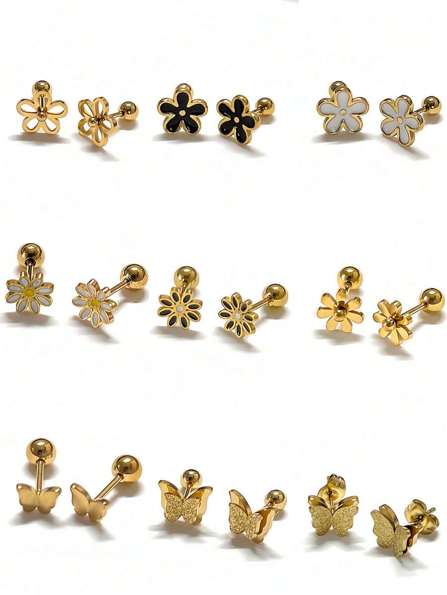 • Delicate 3D Flower Earring Set, Small Stud Earrings, Fashionable, Simple, Textured Design, Suitable For Women To Wear Casually, Black, Gold, Steel Grey Tones Valentines - Multicolor - View 19