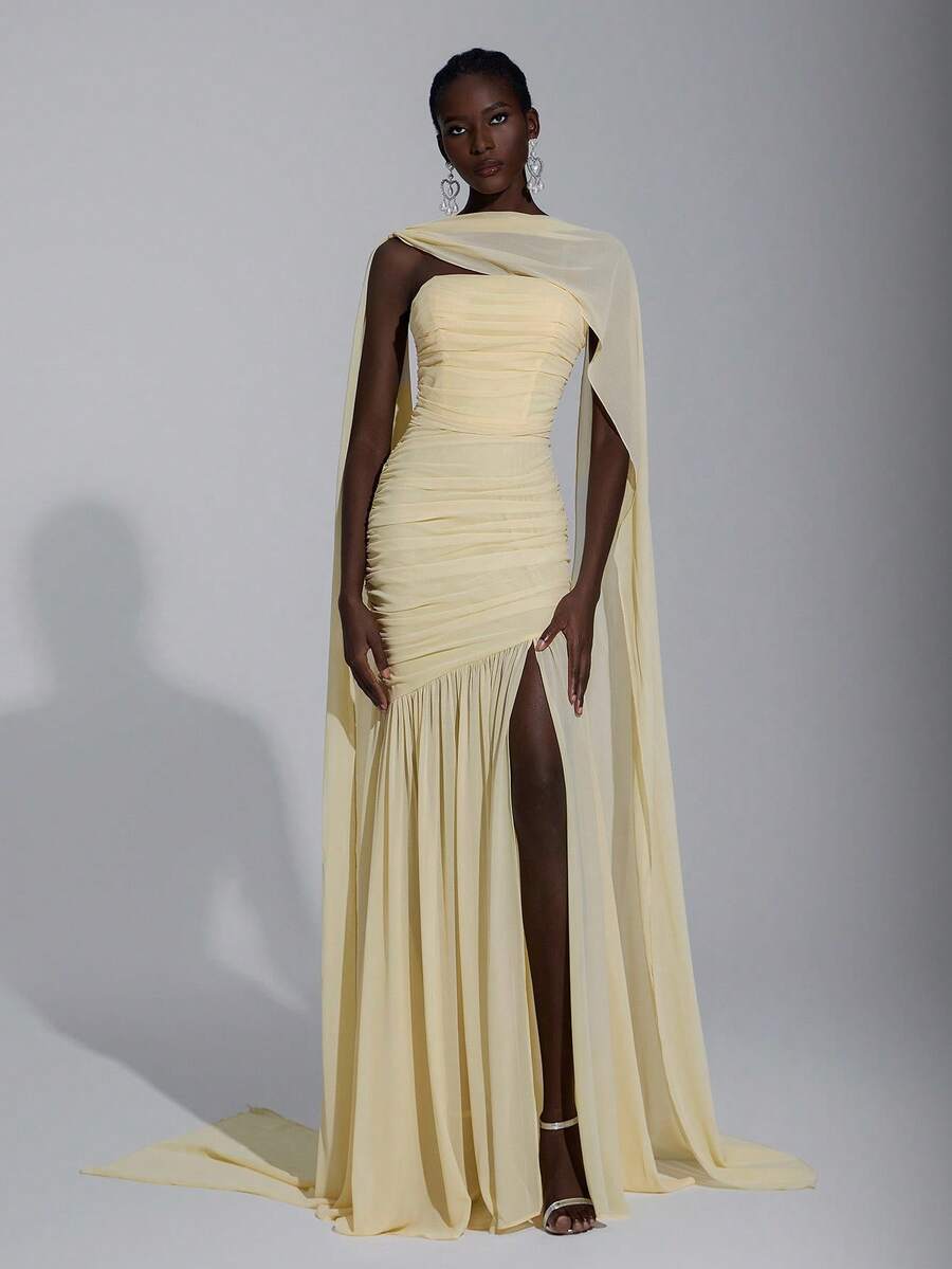 Elitara Elegant Cream Yellow Simple & Chic Chiffon Halter Neck (Detachable Sequins) Bust Ruched Hem Mesh Sheer Fishtail Dress, Suitable For Dates, Vacation, Weddings, Bridesmaid Events