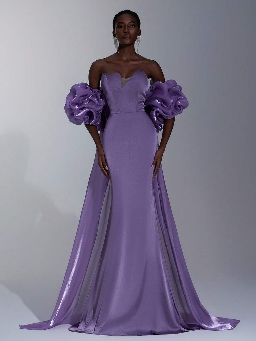Elitara Elegant Taro Purple Minimalist Asymmetric Strapless Neckline Fitted Mermaid (Detachable 2 Pieces) Exaggerated 3D Ruffle Trailing Sequin Embellished Evening Gown