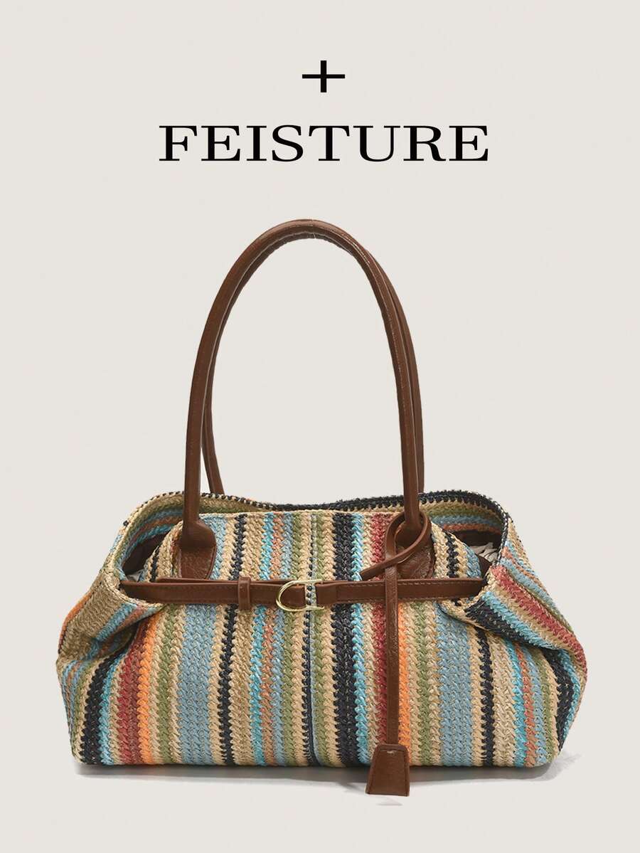 FEISTURE 1pc Colorful Woven Tote Bag, Large Capacity, Strap Decor, Magnetic Closure, Suitable For Daily Commute, Shopping, Vacation Travel