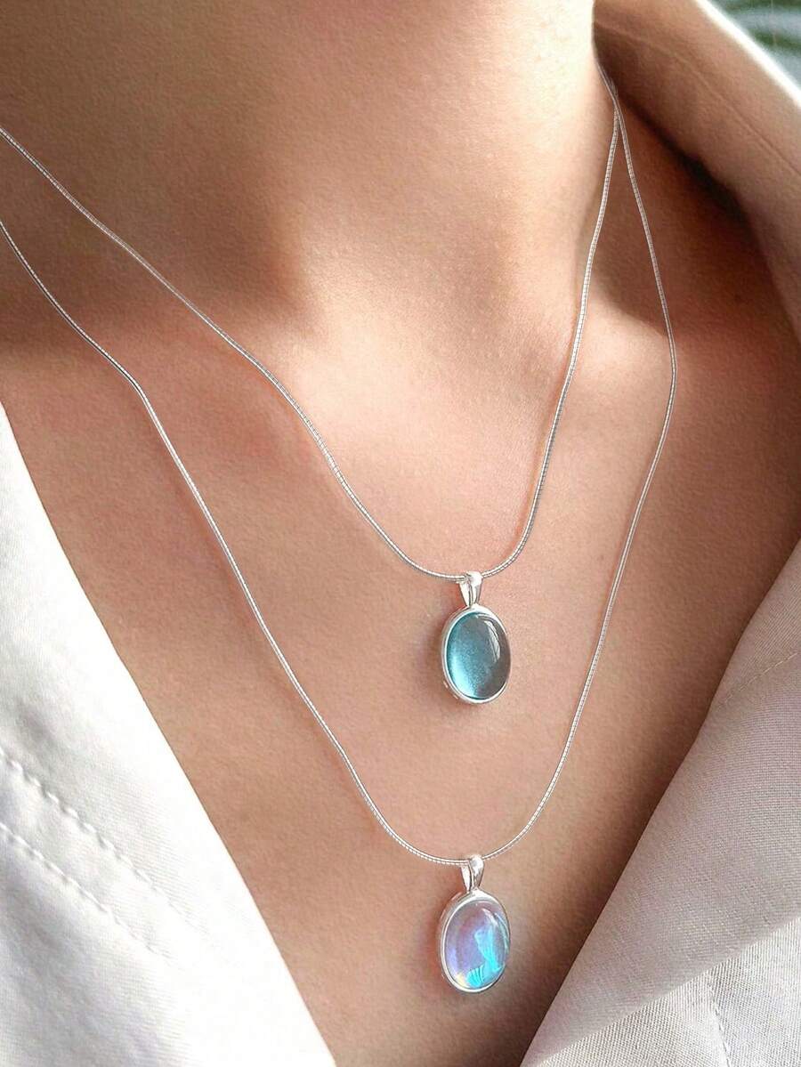 Fashionable Unique Design S925 Sterling Silver Multilayered Pendant Necklace With Moonstone & Blue Gemstone Holiday