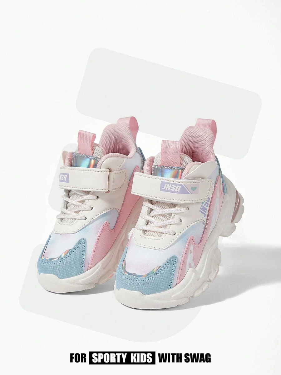 JNSQ Girls Hook-and-loop Fastener Lace Up Design Letter Graphic Chunky Shoes For Spring