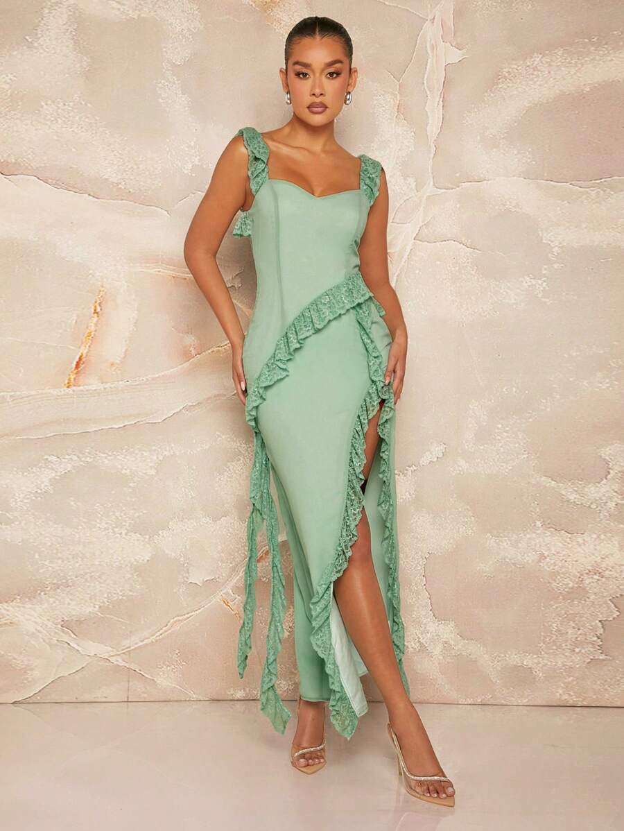 L'Amorae Asymmetric Lace Ruffle Draped Split Party Dress