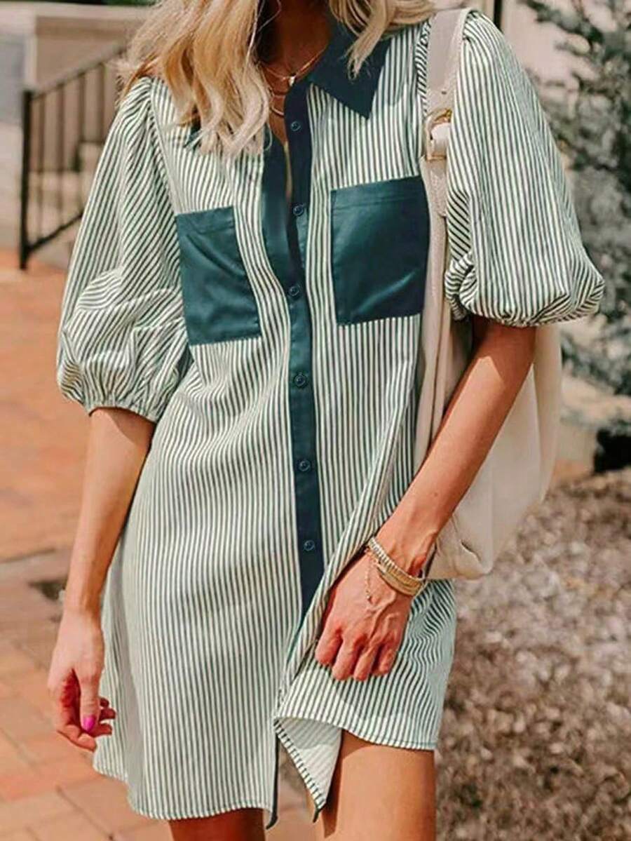 Ladies' Holiday Bubble Sleeve Shirt Dress, Summer New Striped Printed Straight Leg Short Dress